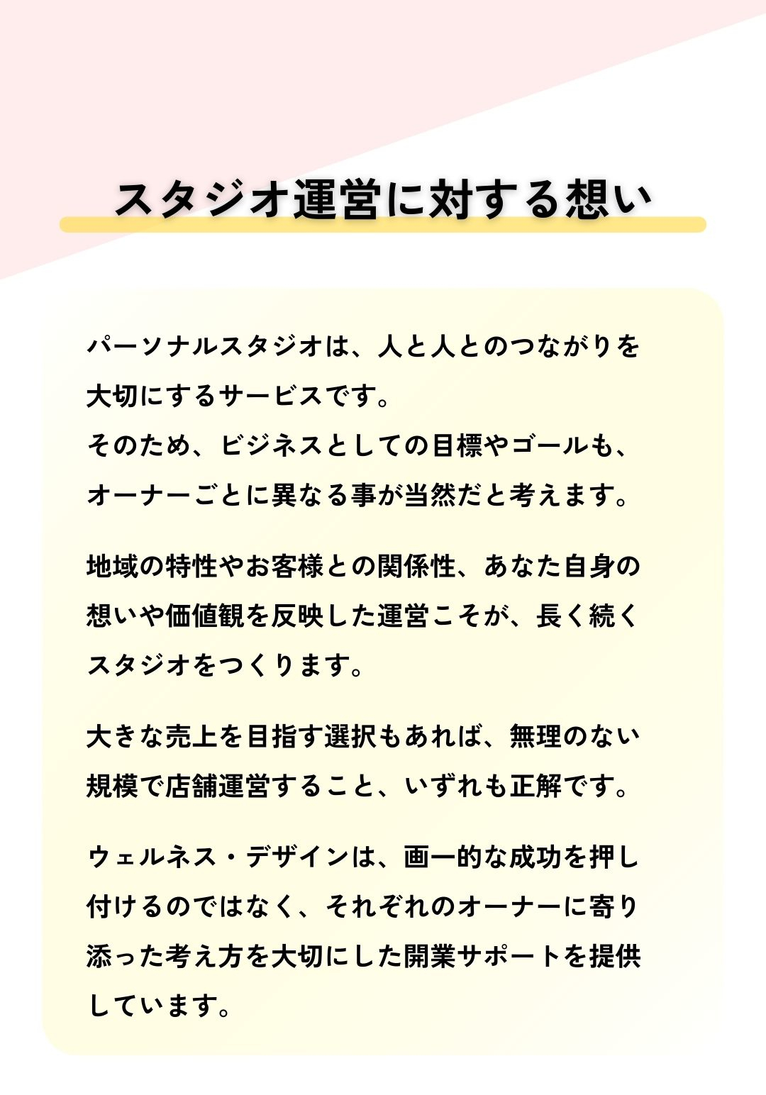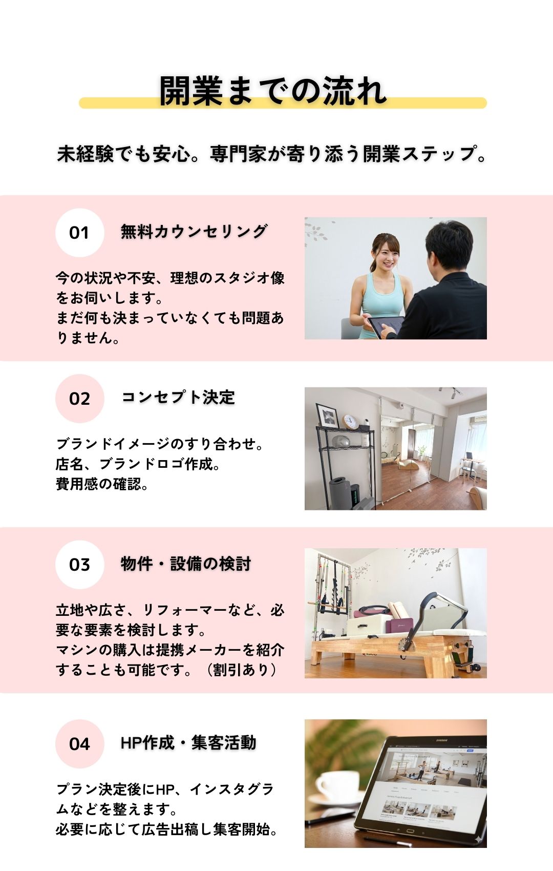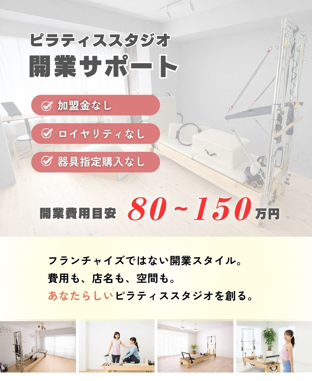 スタジオの規模や内容によって異なりますが、無理のない範囲で始められるよう現実的な開業設計を行います。マシン、備品の購入と物件の契約などで80~150万円が目安となります。