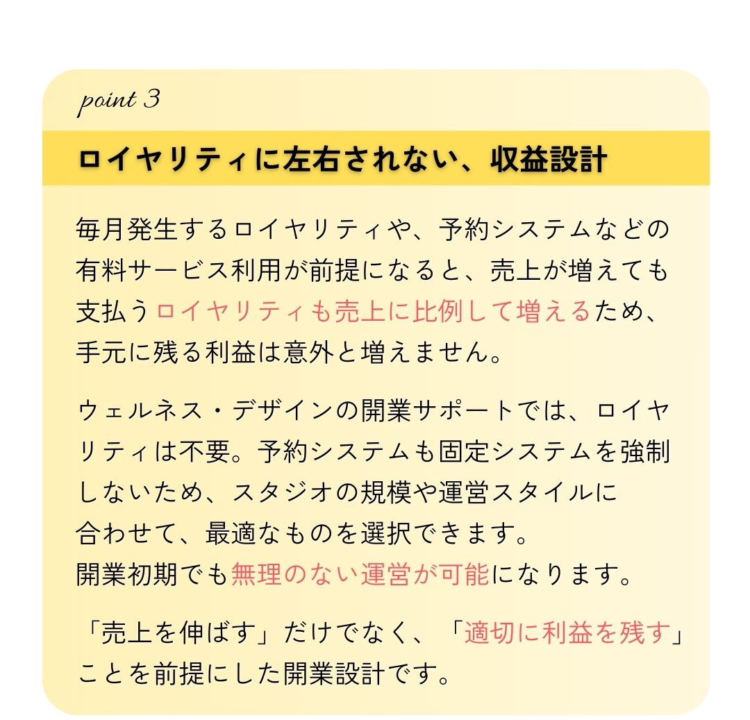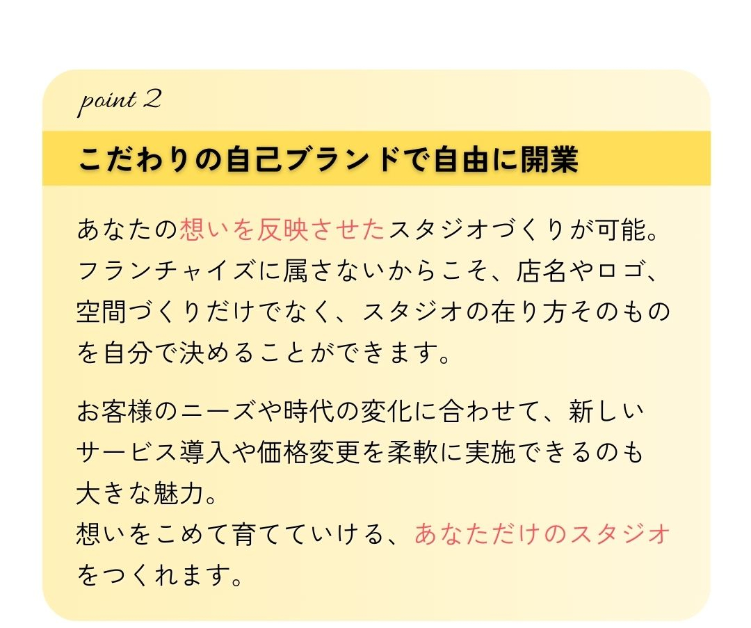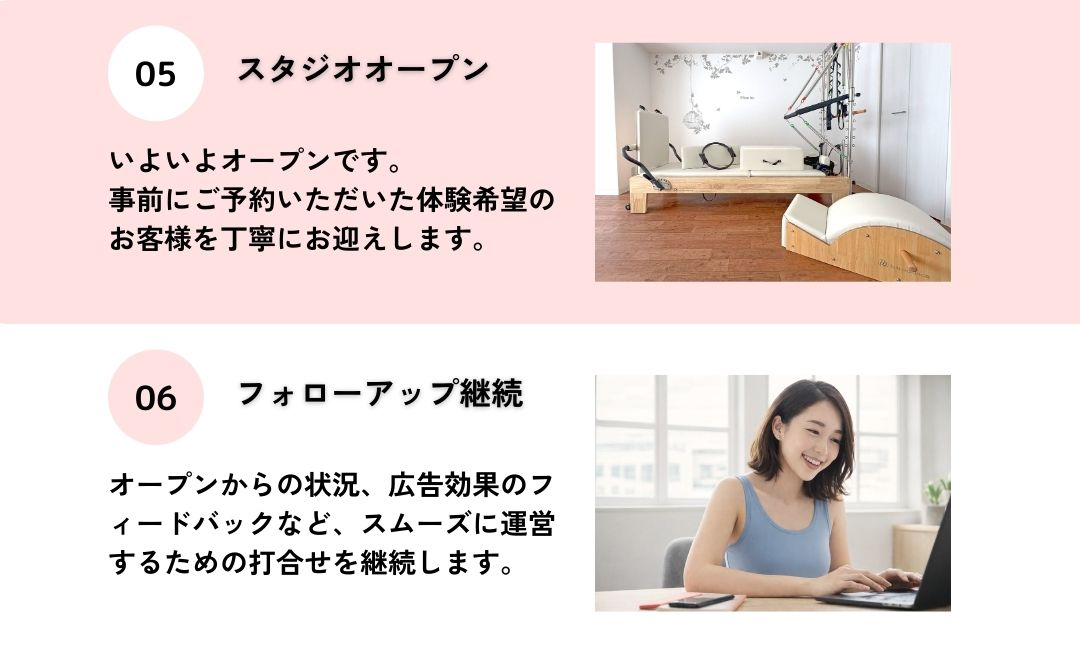 スタジオの規模や内容によって異なりますが、無理のない範囲で始められるよう現実的な開業設計を行います。マシン、備品の購入と物件の契約などで80~150万円が目安となります。